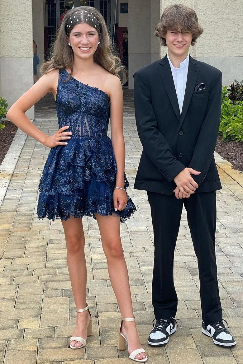 This Lumidress one-shoulder homecoming dress sparkles with youthful elegance and modern charm. The asymmetrical neckline highlights the shoulders with a chic, confident touch, while the fitted natural waist flows into a playful A-line silhouette. Layers of tiered tulle create volume and movement, delicately embroidered with shimmering sequins that catch the light from every angle. Perfectly balanced between sophistication and fun, this short dress is designed to make every entrance unforgettable.